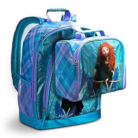 Princess Merida art work and display artwork accents on outer layer of clear PVC over glittering under layer Backpack measures 15'' H x 12'' W x 5'' D and lunch tote measures eight'' H x 8 1/2'' W x four 1/2'' D Lunch tote options insulated inside with food-grade interior lining, interior mesh compartment with self-stick fabric fastener, inside ID label, two zip pulls, canvas handle, and easy againpack attachment Authentic and exclusive Disney Store merchandise with reliable high quality and durability Backpack options exterior zipper compartment, two facet mesh pockets, canvas prime straps, inside ID label, padded back with adjustable padded back straps, and loop to attach matching lunch tote